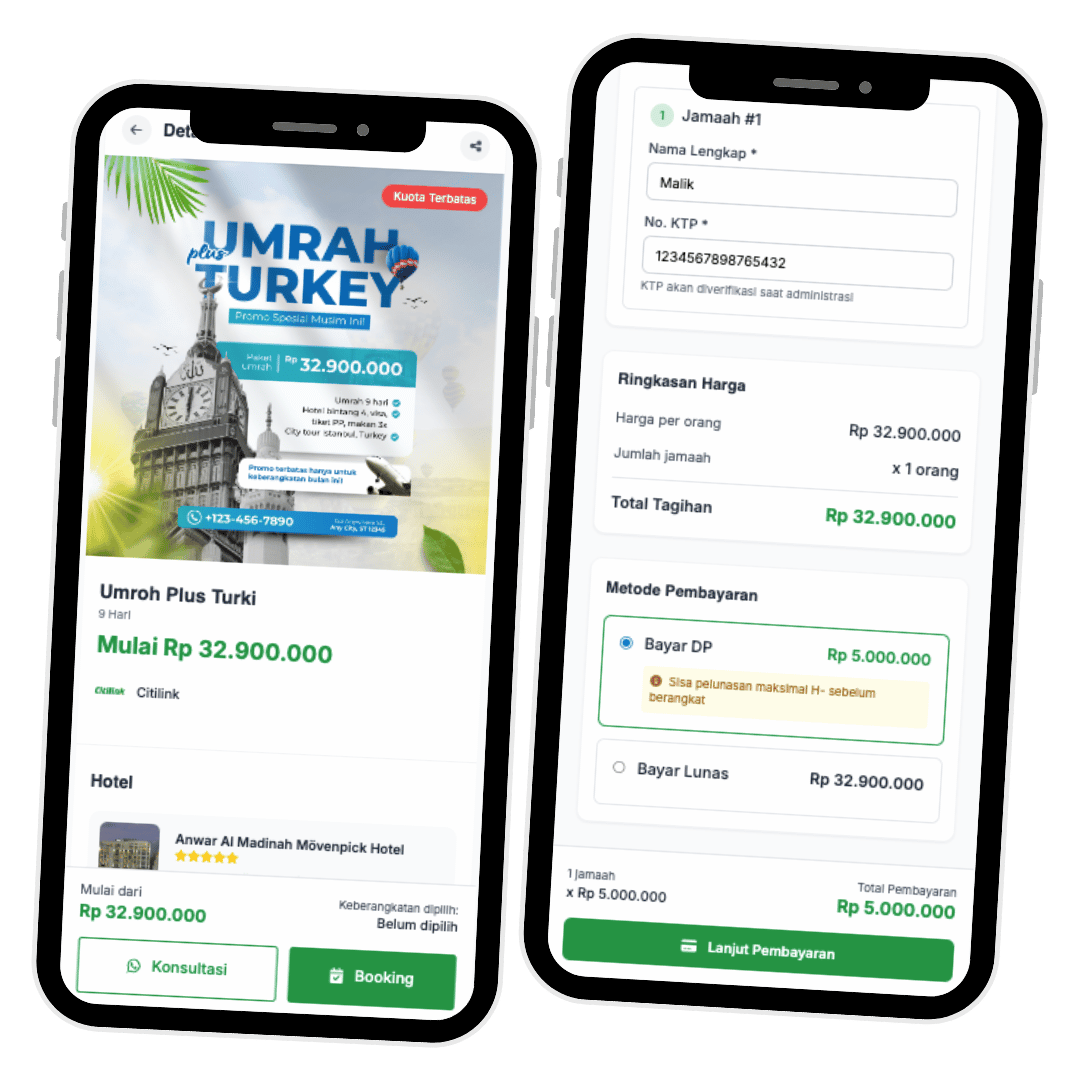 Permudah jamaah melakukan booking dan pembayaran dengan dukungan DP, cicilan, atau pelunasan. Terintegrasi dengan payment gateway seperti QRIS dan Virtual Account, sehingga transaksi lebih cepat, aman, dan otomatis tercatat di dashboard Anda.