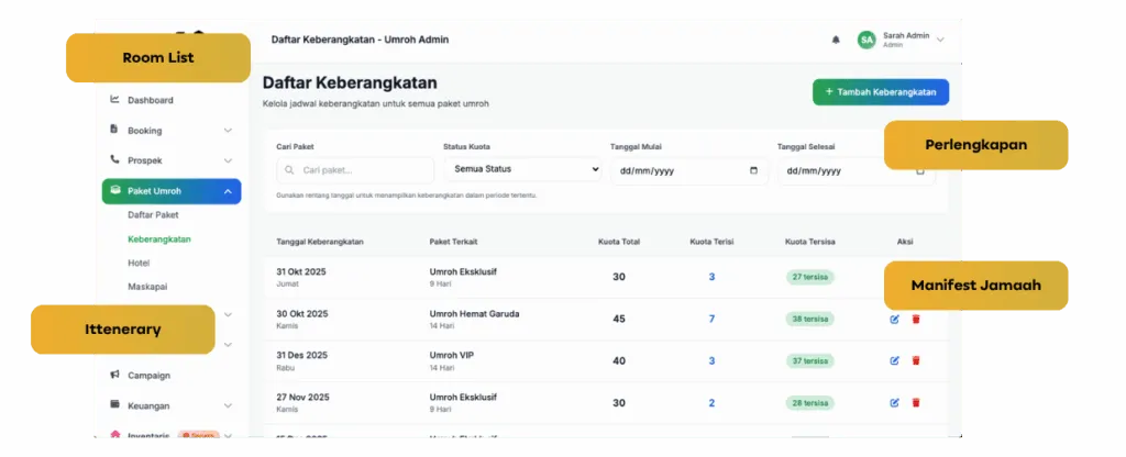 Kelola semua paket umroh dengan mudah—mulai dari itinerary, jadwal keberangkatan, hotel, maskapai, harga, hingga komisi affiliate. Semua data tersusun rapi dalam satu sistem.