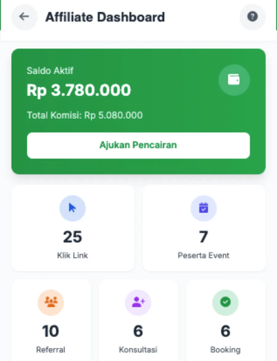 Aktifkan agen Anda dengan link affiliate unik yang mencatat semua klik, konsultasi, dan booking secara otomatis. Tanpa input manual, tanpa data tercecer. Agen bisa langsung promosi lewat WhatsApp, Facebook, dan Instagram dengan tracking yang rapi dan real-time.