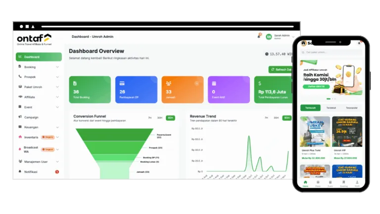 Ontaf menggabungkan sistem affiliate dan funnel marketing agar agen lebih produktif dan proses booking lebih terukur.
